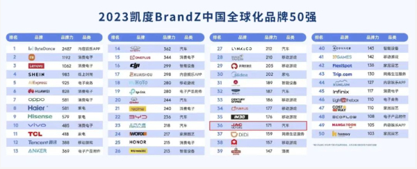江淮汽车荣登BrandZ全球化品牌50强第36位